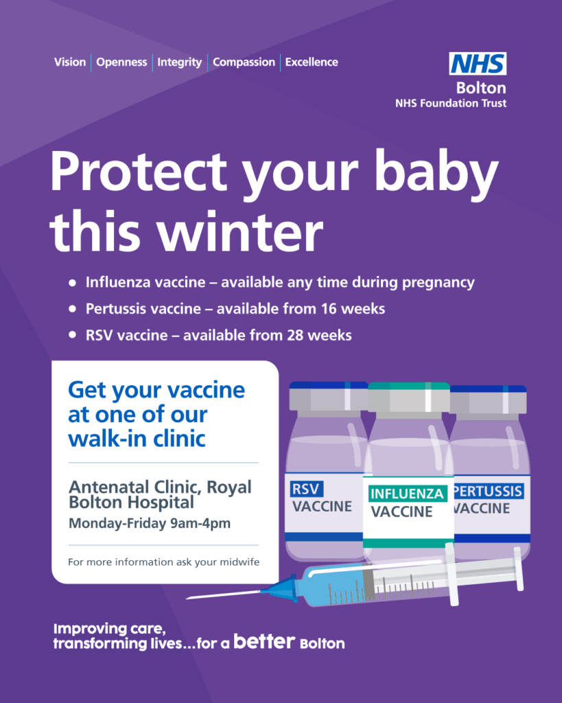 Pregnant women across Bolton are being encouraged to protect themselves and their babies this winter by getting vaccinated against influenza (flu), pertussis (whooping cough), and RSV (Respiratory Syncytial Virus).